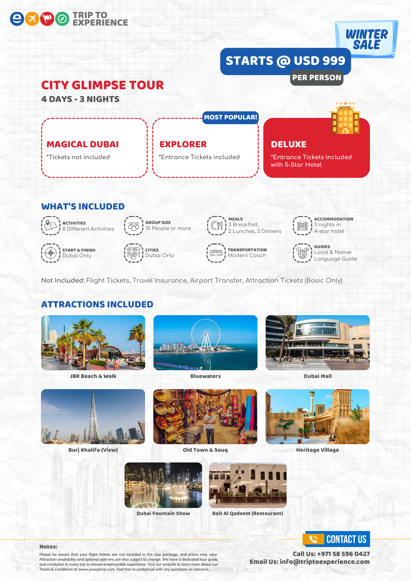 Enjoy an exciting sightseeing tour and non-stop fun at the most popular tourist destinations, such as JBR, Bluewaters Island and Dubai Mall, to have a perfectly blissful holiday.
